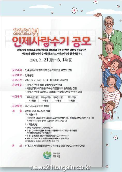 인제군이 인제군에 대한 인식개선을 통해 전입 장려 분위기를 조성하고, 이웃과 다함께 잘사는 7만 인제군민 실현을 위해 처음으로 추진하는‘2021년 인제사랑 수기 공모’를 21일부터 접수한다.