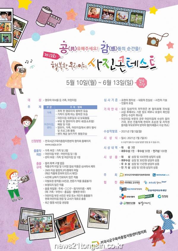 부평구(구청장 차준택)육아종합지원센터는 21일 5월 가정의 달을 맞아 전국육아종합지원센터협의회와 공동으로 ‘공감, 제13회 행복한 우리 아이 사진콘테스트’를 진행한다.