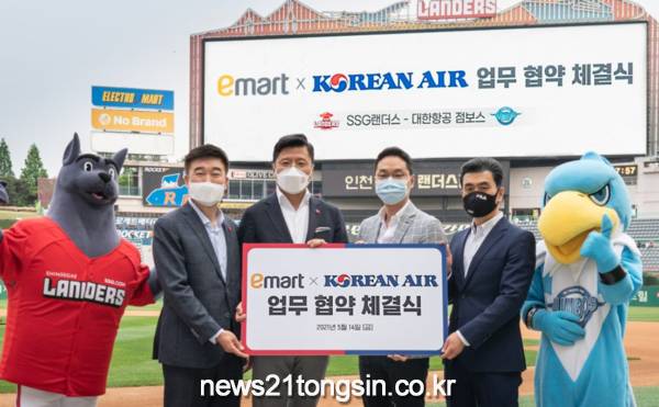 양사는 5월 14일 오후 인천 SSG랜더스필드에서 대한항공 장성현 마케팅/IT부문 부사장, 대한항공 점보스 배구단 권혁삼 스포츠단장, 이마트 마케팅 담당 최훈학 상무 그리고 SSG랜더스 민경삼 대표이사 등이 참석한 업무 협약식을 가졌다.