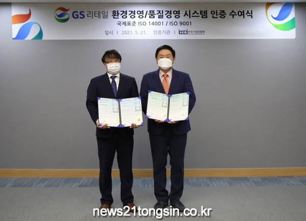 환경·품질경영시스템 인증서 수여식은 5월 21일 서울 강남구 역삼동 GS타워(GS리테일 본사) 20층에서 진행됐다. 수여식에는 허연수 GS리테일 ESG추진위원장(대표이사 부회장)과 박형준 한국기업인증원장이 참석해 자리를 빛냈다.