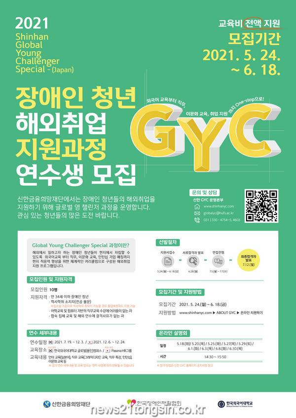 신한금융희망재단(이사장 조용병)은24일부터 다음달 18일까지 청년 해외취업 지원사업인 『Global Young Challenger』(이하 신한 GYC) 3기를 모집한다.