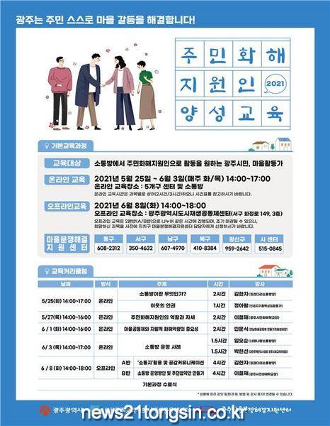 광주광역시는 이웃간 발생할 수 있는 다양한 생활갈등을 주민 스스로 대화와 타협을 통해 해결할 수 있도록 생활 속 화해전문가를 발굴‧양성하는 ‘주민화해지원인 양성교육’을 실시한다.
