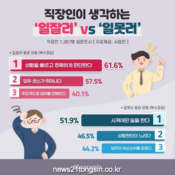 회사에서 일을 하다 보면 모두의 선망의 대상이 될 만큼 일을 잘하는 ‘일잘러’ 동료를 만나기도 하고 어떻게 회사 생활을 계속하는지 의문이 될 만큼 일을 못하는 ‘일못러’ 동료를 만나기도 한다. 직장인이 생각하는 일 잘하는 동료와 일 못하는 동료들은 어떤 유형일까?