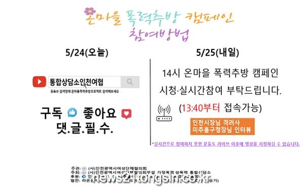 인천광역시(시장 박남춘)는 가정․성폭력, 아동학대 등 각종 폭력으로부터 취약계층인 여성과 아동을 지키기 위한‘온 마을 폭력추방 캠페인’을 연중 온라인으로 진행한다고 밝혔다.
