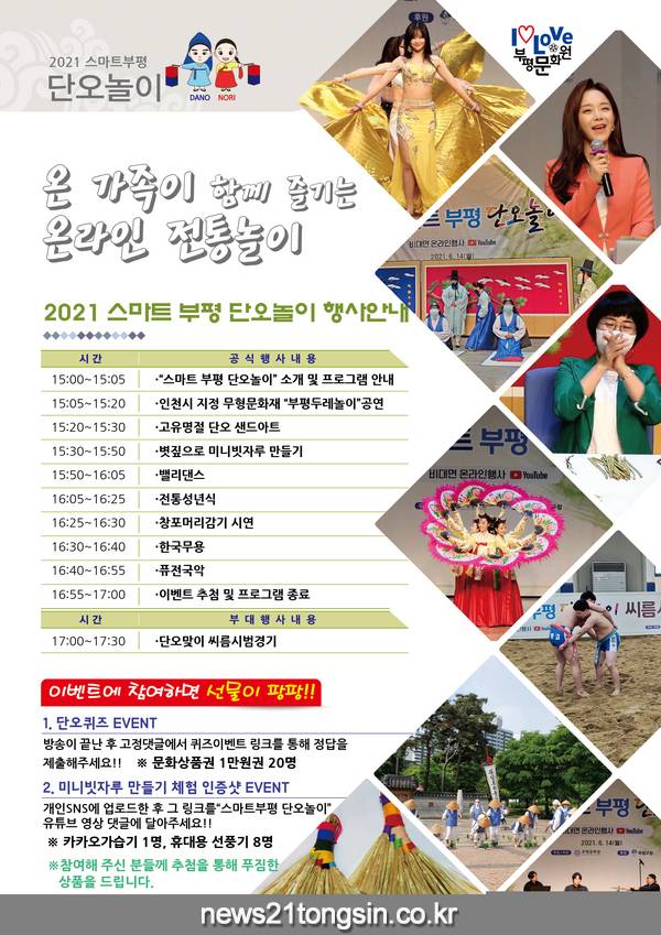 축제는 부평문화원 유튜브 채널을 통해 관람할 수 있으며, 미니빗자루 만들기 체험 인증샷 및 단오퀴즈 이벤트 참여를 통해 다양한 선물도 받을 수 있다. 자세한 사항은 부평문화원(☎505-9001)으로 문의하면 안내받을 수 있다.