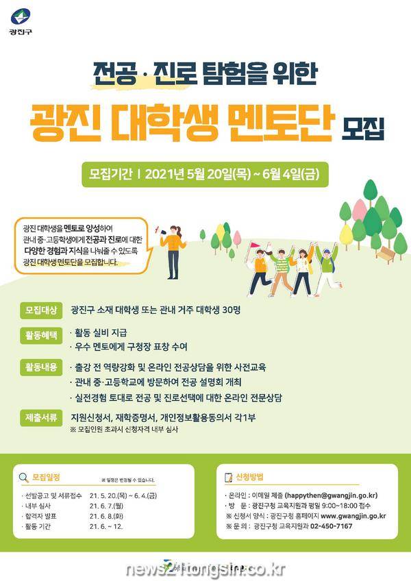 광진구(구청장 김선갑)가 6월 4일까지 지역 내 중·고등학생에게 경험과 지식을 공유해 줄 ‘광진 대학생 멘토단’을 모집한다.