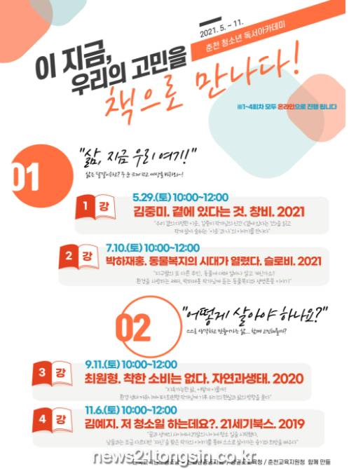 춘천‧화천 지역 중고생 독서동아리 연합활동인 ‘청소년독서아카데미’는 △1학기, “삶, 지금 우리 여기!”, △2학기, “어떻게 살아야 하나요?” 라는 주제로 4회에 걸쳐 온라인으로 진행한다.