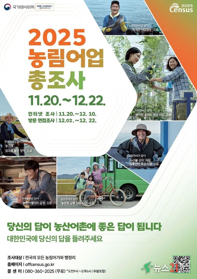 서울 강서구(구청장 진교훈)는 오는 20일(목)부터 다음 달 22일까지 통계청 주관 ‘2025년 농림어업총조사’를 실시한다고 밝혔다. 농림어업총조사는 5년마다 전국 단위로 실시하는 전수 조사로, 농가·임가·어가의 규모와 구조 등을 종합적으로 파악해 향후 정책 수립에 필요한 기초자료를 마련하는 데 목적이 있다. 조사 대상...
