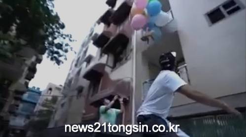 달러는 풍선에 묶여 건물 벽을 따라 떠올랐다. 몇 초 뒤 2층 발코니에서 누군가 이 개를 붙잡았다.