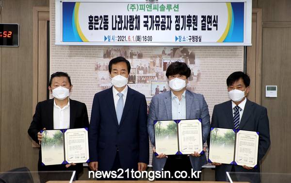 주식회사 피앤씨솔루션이 ‘홍은2동 나라사랑채’에 거주하는 국가유공자들에게 정기적인 후원을 약속했다.