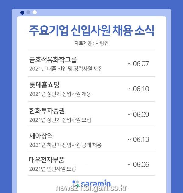 OECD는 최근 올해 우리 경제 성장률을 지난 3월 전망치 3.3%에서 3.8%로 상향조정했다. 백신 접종에 따른 경기 회복과 수출 호조 등 산업계 전반에 코로나19 극복에 대한 기대감이 감도는 가운데, 국내 주요 기업들도 신입사원 공개채용에 나서고 있다. 구인구직 매칭플랫폼 사람인(www.saramin.co.kr, 대표 김용환)이 국내 주요기업 공채 정보를 정리했다.