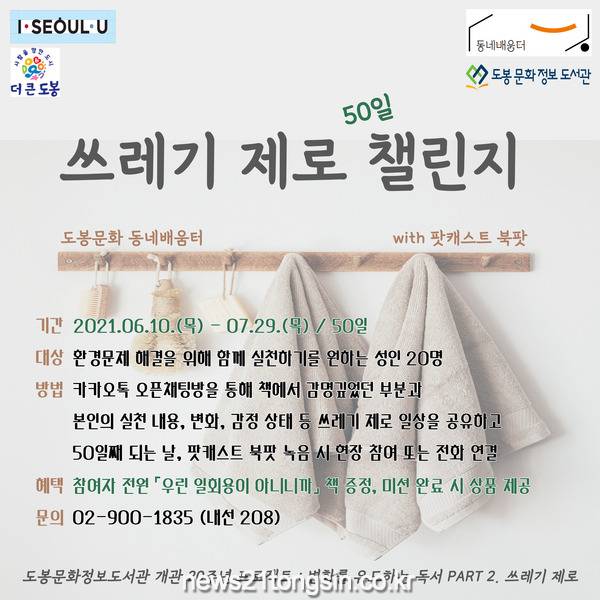 도봉구(구청장 이동진) 도봉문화정보도서관은 ‘변화를 유도하는 독서’ 프로젝트의 일환으로 오는 6월 10일부터 50일 동안 SNS를 이용하여 20명의 신청자와 함께 ‘쓰레기 제로 챌린지‘를 진행한다.