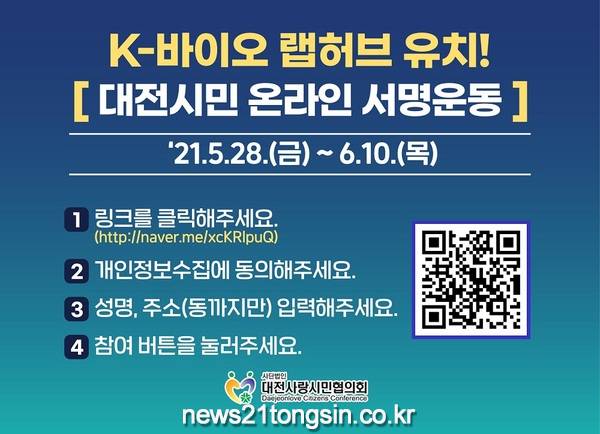 이에 시민사회단체가 힘을 모아 케이(K)-바이오 랩허브 대전유치 서명 운동에 팔 걷어 부치고 나섰다. 서명 운동은 오프라인과 온라인(http://naver.me/xcKRlpuQ) 병행해서 610일까지 진행 중에 있다.