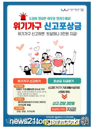 신고대상은 실직·폐업 등으로 경제적 소득이 없어 생계가 곤란한 가구, 질병·장애 등 건강 문제로 도움이 필요한 가구, 그 밖의 위기상황으로 도움이 필요한 가구이다.