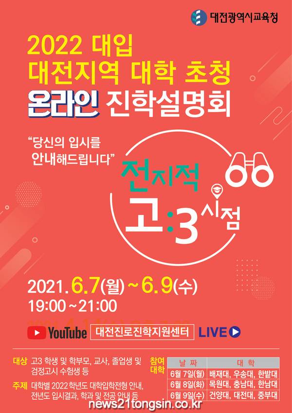 대전지역 대학과 함께하는 ‘2022 대입 온라인 진학설명회’는 코로나19 감염 위기로 대면 입시설명회가 어려운 상황에서 6월 7일(월)부터 6월 9일(수)까지 3일간 저녁 7시 대전진로진학지원센터 유튜브 채널을 통해 실시간 방송된다.