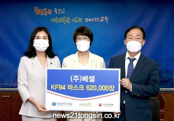 대전광역시교육청(교육감 설동호)은 6월 9일(수) ㈜베셀(대표이사 이항주)로부터 코로나19 예방을 위한 KF94 마스크 620,000장(4억원 상당)를 기탁받았다고 밝혔다.