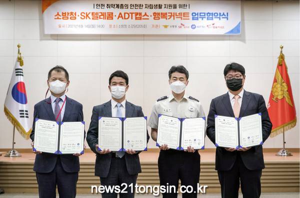 SK텔레콤(대표이사 박정호)과 소방청(청장 신열우), ADT캡스(대표 박진효), 행복커넥트(이사장 유웅환)는 14일 오후 세종시 소방청 본부에서 ‘상호 협력을 위한 업무협약’을 체결했다.
