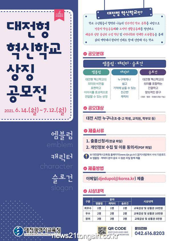 대전광역시교육청(교육감 설동호)은 6월 14일(월)부터 7월 12일(월)까지 대전지역 초·중·고 학생, 학부모, 교직원, 대학생, 시민을 대상으로 「대전형 혁신학교 상징(엠블럼, 캐릭터, 슬로건) 공모전」을 운영한다고 밝혔다.