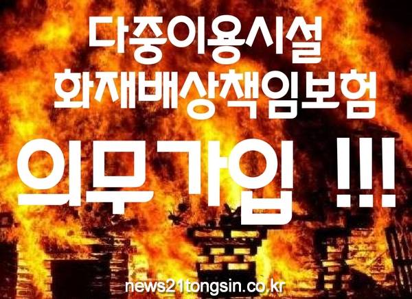 (대구=뉴스21통신) 유재원기자 = 대구소방안전본부는 오는 7월 6일(화)부터 모든 다중이용업소는 영업주의 과실이 없는 화재 피해도 보상받을 수 있도록 무과실 화재배상책임보험에 반드시 가입해야 한다고 밝혔다.