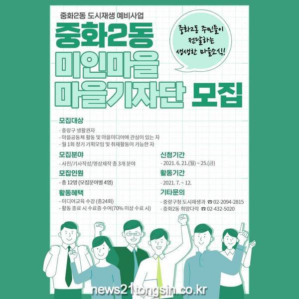 중랑구(구청장 류경기)는 도시재생 예비사업이 진행 중인 중화2동 ‘미인마을’에서 다양한 소식을 생생하게 전달할 ‘마을기자단’ 12명을 모집한다고 밝혔다.