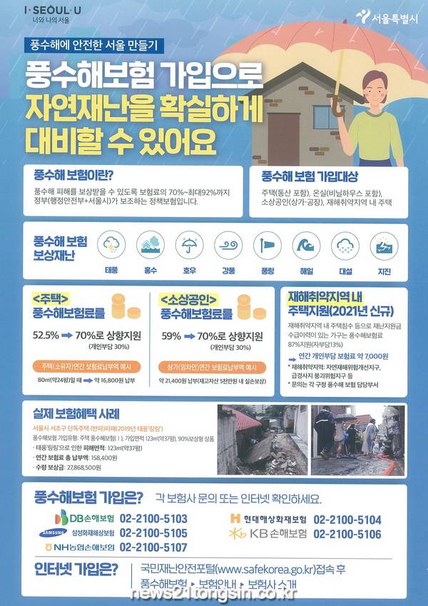 「풍수해보험」은 태풍, 홍수, 호우, 강풍, 지진 등 풍수해 피해를 보상받을 수 있도록 보험료의 70%에서 최대 92%까지 행안부와 서울시가 보조하는 정책보험으로, ▲주택(동산 포함) ▲온실(비닐하우스 포함) ▲소상공인(상가?공장) ▲재해취약지역 내 주택 등을 가입대상으로 한다. 이번 풍수해보험은 주택일 경우 풍수해보험료를 52.5%→70%(개인부담 30%)로, 소상공인일 경우 59%→70%(개인부담 30%)로 상향 지원한다.