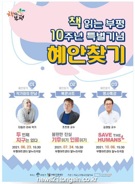‘혜안찾기’ 참가비는 무료며, 부평구립도서관 유튜브 채널을 통해 행사 당일 생중계로도 볼 수 있다. 기타 자세한 사항은 부평구립도서관 홈페이지 공지사항, 또는 전화(☎500-2086)로 문의하면 된다.