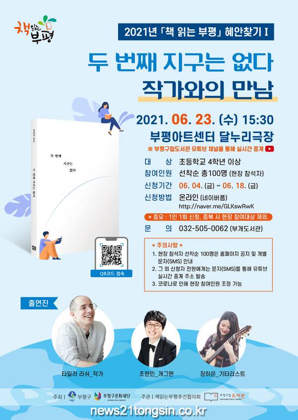 ‘작가와의 만남’에서는 2021년 책 읽는 부평 대표도서인 ‘두 번째 지구는 없다’ 작가 타일러 라쉬와 인천 대표 개그맨 조현민이 책에 대해 깊이 있는 대화를 나눌 예정이다. 이날은 행사에 앞서 최고의 기타리스트이자 영화 ‘다시 만난 날들’의 주연배우인 장하은의 기타 공연도 준비돼 있다.