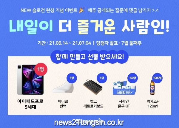 신규 브랜드 슬로건 런칭을 기념하는 이벤트도 준비했다. 이벤트는 사람인의 취업 관련 커뮤니티 소통 서비스인 ‘취준진담’ 내 이벤트 페이지를 통해 누구나 쉽게 참여할 수 있다. 매주 공개되는 질문을 확인하고 질문에 대한 답변을 댓글로 남기면 자동으로 응모된다. ‘내가 생각하는 즐거운 내일은 무엇인가요?’를 비롯해 세 차례에 걸쳐 일에 관한 질문이 공개될 예정이며, 세 가지 질문에 모두 댓글을 남기면 선물 받을 확률이 높아진다.