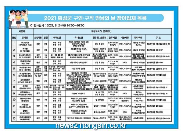 횡성군(군수 장신상)은 ‘2021년 구인·구직 만남의 날’을 오는 6월 24일(목) 오후 2시부터 4시까지 횡성문화예술회관 1층에서 개최한다고 밝혔다.