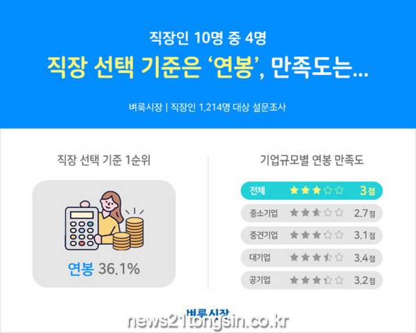 생활 밀착 일자리를 제공하는 벼룩시장이 직장인 1214명을 대상으로 설문조사를 진행한 결과, 응답자 36.1%가 현재 재직 중인 직장을 선택할 때 가장 중요하게 생각했던 요소로 ‘연봉’을 1순위로 꼽았다.