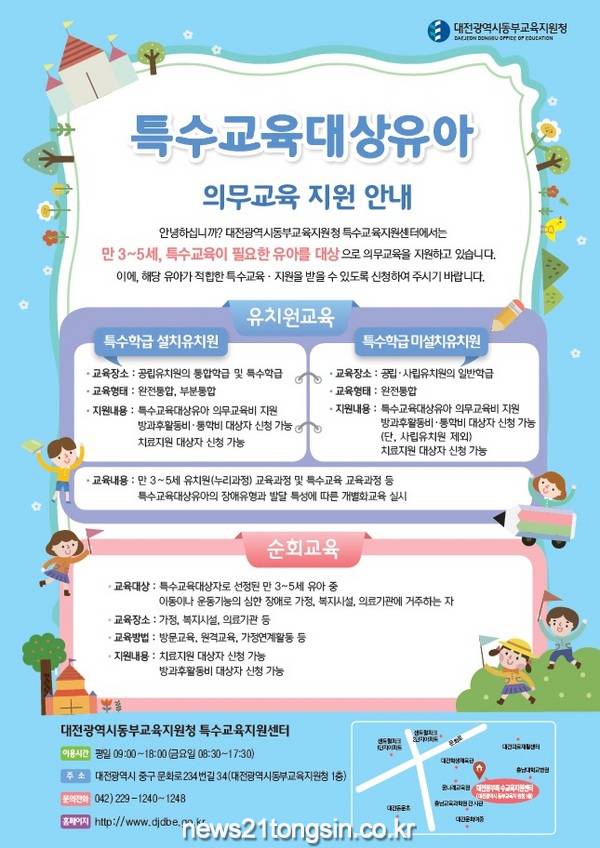 대전광역시동·서부교육지원청(교육장 유덕희, 이해용) 특수교육지원센터에서는 ‘특수교육대상영·유아 교육지원 안내’ 홍보물을 제작하여, 대전 지역 교육기관, 의료기관, 구청 및 주민센터 등에 배부한다고 밝혔다.