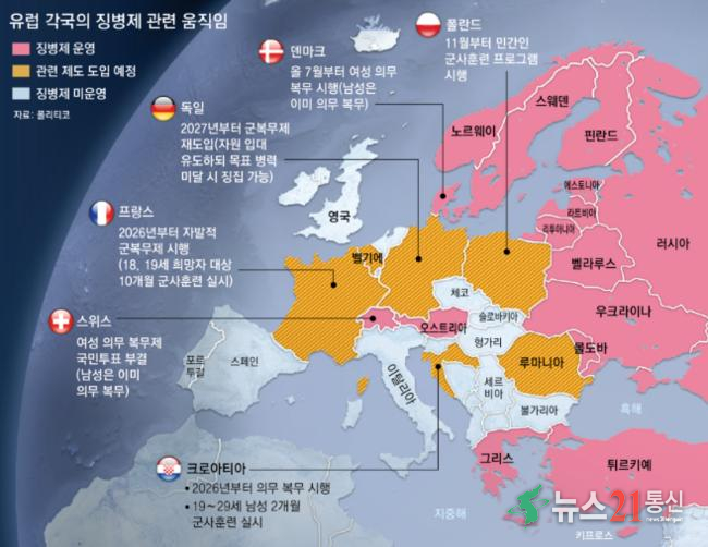 [뉴스21 통신=추현욱 ] 러시아의 우크라이나 침공으로 안보 위기가 커진 유럽 각국에선 징병제 부활 등 군복무제 개편 움직임이 활발하다. 특히 최근 도널드 트럼프 2기 행정부의 ‘미국 우선주의’ 외교로 “미국이 유럽을 돕지 않을 수 있다”는 우려가 커진 것도 한몫하고 있다. 이른바 ‘유럽 자강론’이 확산되면서 국.