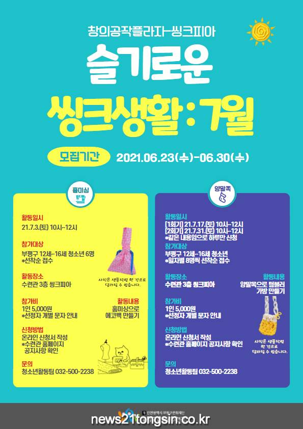 창의공작플라자 씽크피아는 부평구 청소년수련관의 특화시설 중 하나다. 이번 프로그램은 올해의 주제인 환경을 테마로 ▲홈미싱으로 에코백 만들기 ▲양말목으로 텀블러 가방 만들기 등 총 2가지로 실시한다.