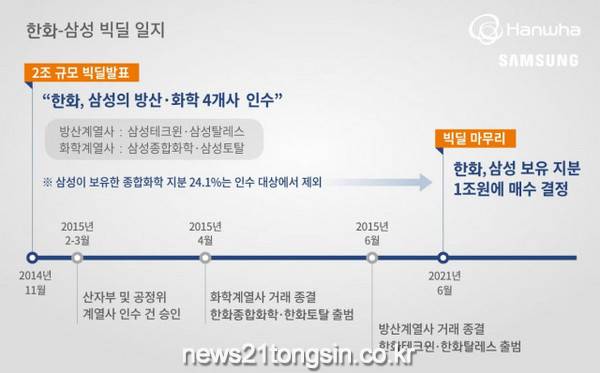 한화는 2015년 삼성으로부터 방산·화학 계열 4개사를 약 2조원에 인수하는 ‘빅딜’을 성사시켰다. 당시 삼성종합화학(현재 한화종합화학)에 남아있던 삼성 측 지분을 이번에 한화가 모두 인수하면서 두 그룹의 빅딜은 6년 만에 마무리됐다.