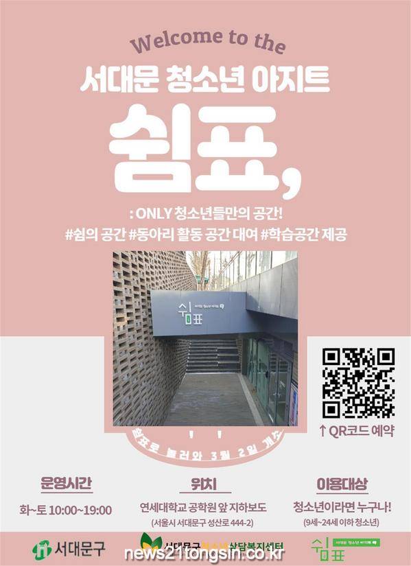 서대문구가 연세대학교 정문 앞 지하보도에 올해 3월부터 청소년 아지트 ‘쉼표’(성산로 444-2)를 열어 무료로 운영해 오고 있다.