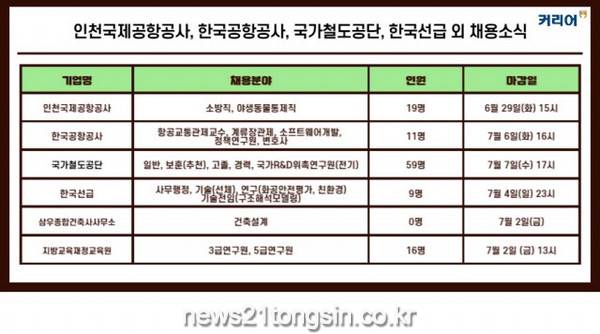취업포털 커리어가 인천국제공항공사, 한국공항공사, 국가철도공단, 한국선급, 삼우종합건축사사무소, 지방교육재정연구원 채용 소식을 25일 발표했다.