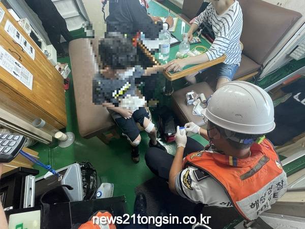 이들을 태운 경비함정 경찰관이 확인한 결과 B군은 양쪽다리에 찰과상을 입었으며 특히 오른쪽 다리는 날카로운 곳에 무릎이 약 8cm가량 찢겨 봉합수술이 필요한 상황으로 응급처치를 실시하는 한편 신속하게 대천항으로 이동했다.