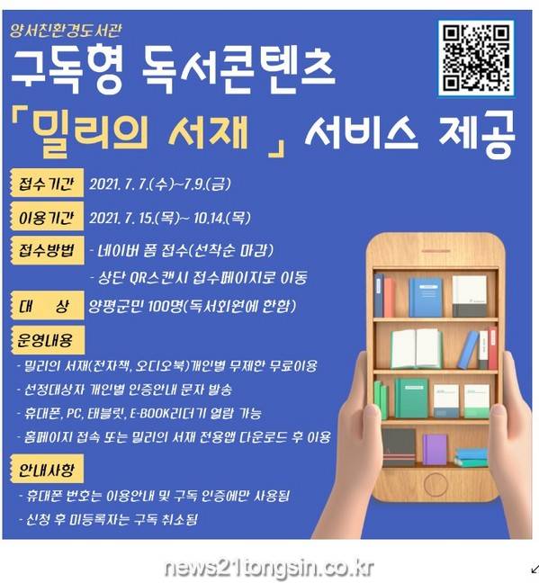 양평군 도서관 구독형 독서콘텐츠 「밀리의 서재」 서비스 접수 및 이용, 전자책 리더기 대여에 따른 문의는 도서관 담당(☎770-2592)으로 하면 된다.