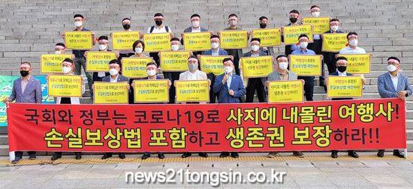(대구=뉴스21통신) 유재원기자 = 국민의힘 김승수 의원(대구북구을, 문체위)은 28일 국회 본청앞에서 여행업협회 회원들과 함께 소상공인보호및지원에관한법률의 산자위 소위 통과를 규탄하고 조속한 소상공인 및 여행업계 보호를 위한 특별법 제정 및 여행업 생존을 위한 정부의 대책을 촉구하는 기자회견을 실시했다.