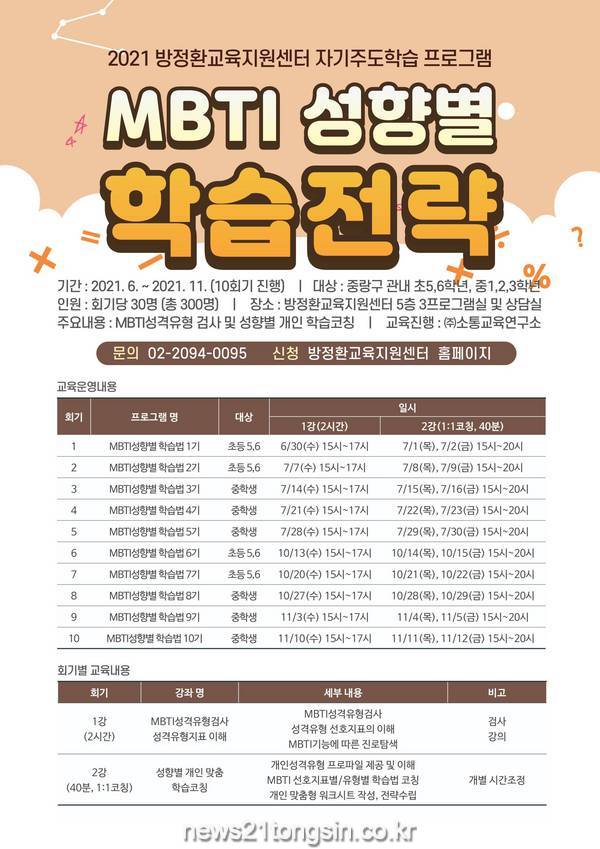 신청을 원하는 학생은 방정환교육지원센터 홈페이지(https://educenter.jungnang.go.kr)의 자기주도학습>MBTI 성향별 학습별 란에서 신청서를 작성해 접수하면 된다.