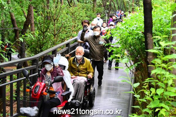중랑구(구청장 류경기)가 28일 봉화산을 찾는 누구나 불편 없이 함께 산을 오를 수 있는 ‘봉화산 동행길’의 제1구간을 주민들에게 개방하고 개통식을 열었다.