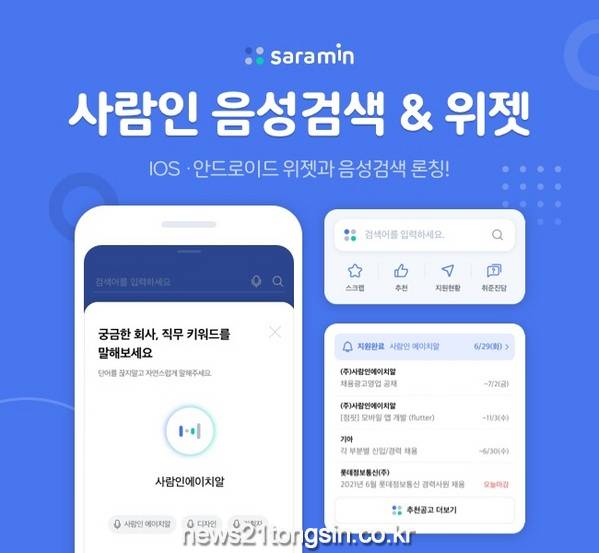 구인구직 매칭 플랫폼 사람인(www.saramin.co.kr 대표 김용환)이 취업플랫폼 최초로 자체 어플리케이션 내 음성인식을 활용한 ‘음성검색’ 기능을 도입했다. 사람인 앱 음성검색 기능은 iOS와 안드로이드 운영체제에 기본 탑재된 음성인식 기능을 활용한 것으로 두 운영체제를 갖춘 디바이스에서 모두 사용이 가능하다.