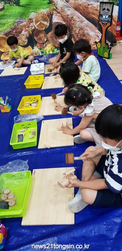 철저한 방역수칙 준수로 이루어진 체험활동에는 전문강사가 초청되어 블럭으로 창의성 만들기 놀이를 할 수 있는 블럭 놀이존, 목재를 이용한 만들기 놀이를 할 수 있는 목공 놀이존, 숲속놀이 포토존 등 다양한 체험과 놀이를 할 수 있는 공간이 마련되었다.