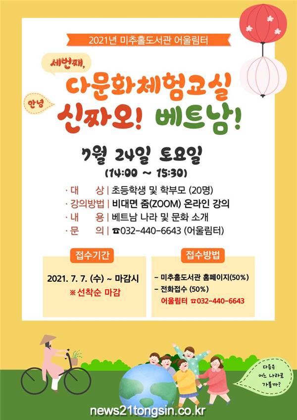 인천광역시(시장 박남춘)는 오는 7월 24일 오후 2시에 미추홀도서관 어울림터에서 비대면 온라인수업(ZOOM)을 활용해 7월 다문화 체험 교실 “신짜오(안녕)! 베트남!”을 진행한다고 밝혔다.