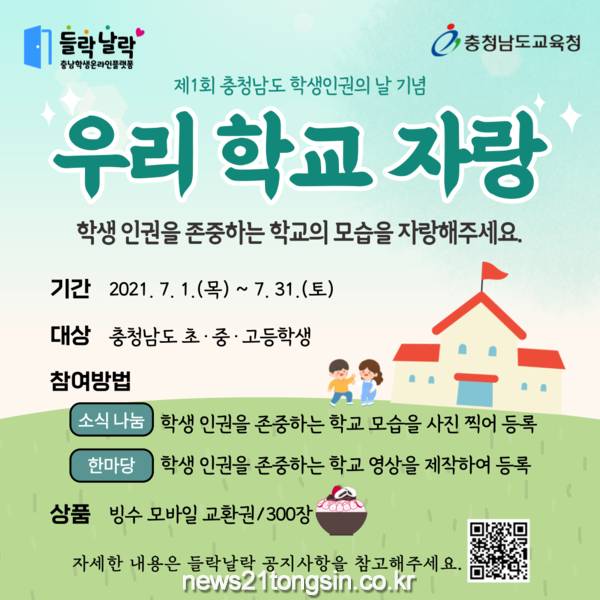 ▲ 제1회 학생인권의 날 기념 온라인 행사 알림그림충남교육청(교육감 김지철)은 제1회 충남 학생인권의 날을 기념하여 학생참여 온라인 행사를 7월 1일부터 31일까지 진행한다. 충남 학생인권의 날은 7월 10일이다. ‘충청남도 학생인권 조례’가 공포된 날을 기념하여 만들어졌다.