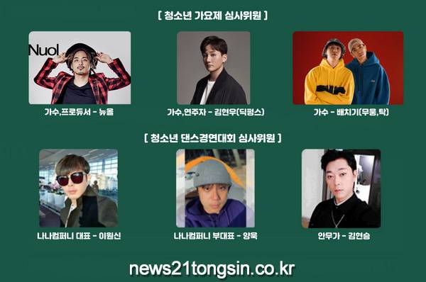 본 페스티벌의 청소년가요제 심사위원으로는 음반 프로듀서 및 가수로 활동 중인 ‘뉴올’, 슈퍼스타K4 준우승에 빛나는 딕펑스의 ‘김현우’, 힙합듀오 가수 ‘배치기’가 참여한다.