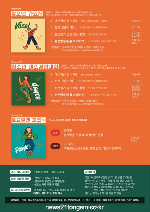 예선 경연은 참가자의 동영상을 접수받아 심사를 진행하고 본선 경연은 부평구청소년수련관 4층 공연장에서 사전 녹화 후 온라인 방송으로 진행된다. 본선 경연은 코로나19에 대한 참가 청소년의 안전을 최우선으로 하기 위해 하루 6팀씩 1시간 간격으로 치러지며 총 4일간 진행되는 본선 경연에는 가요제 12개 팀, 댄스 12개 팀 총 24개 팀이 선발될 예정이다.