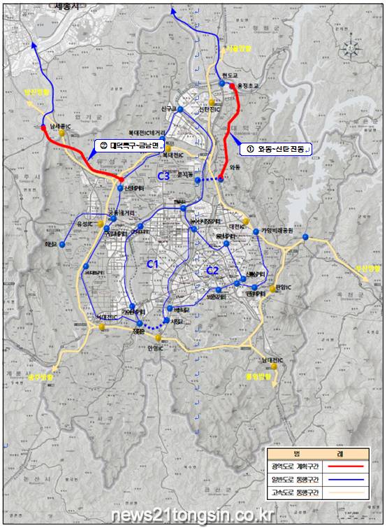 대전시는 지난 5일 대도시권광역교통위원회(이하‘대광위’)가 확정한‘제4차 대도시권 광역교통시행계획(2021~2025)’에 대전권역 2개 사업(총길이15.5㎞)이 포함됨에 따라 광역도로 분야에 앞으로 3,297억 원의 신규 투자가 이루어질 수 있게 됐다고 밝혔다.