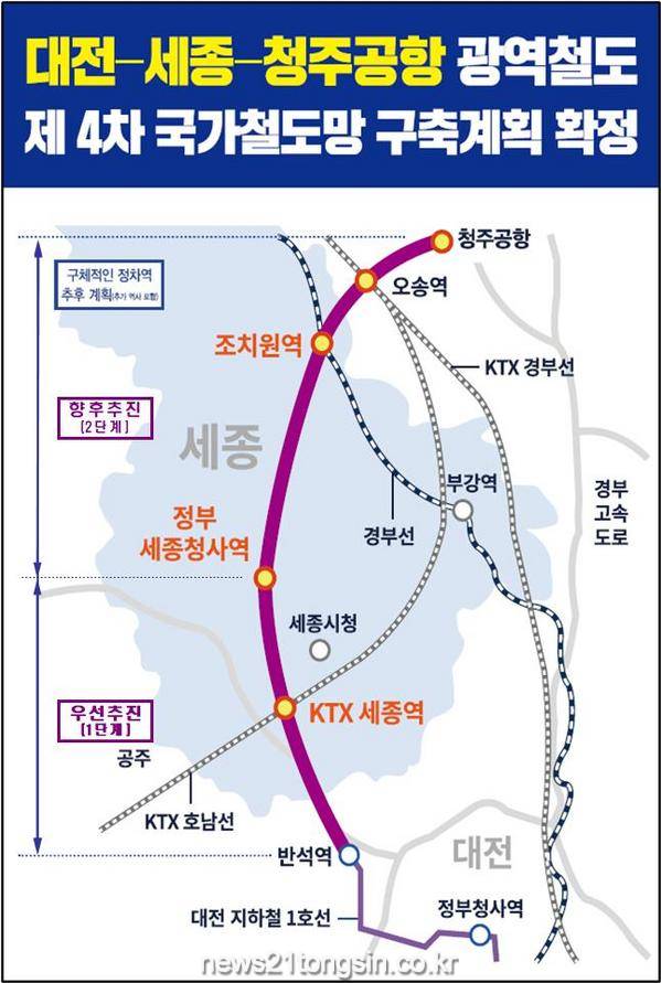 ‘대전~세종 광역철도 사업’은 대전 반석역과 세종시 정부세종청사 간 14km 구간을 대전도시철도 1호선으로 연결하는 사업이다.