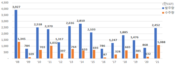 한편, 6월말 현재 수주잔량은 2,673만CGT로 전년동기(1,996만CGT) 대비 34% 증가하였으며, 이는 과거 3년(‘18~’20)간의 건조량*(2,609만CGT)보다 높은 수준이다.